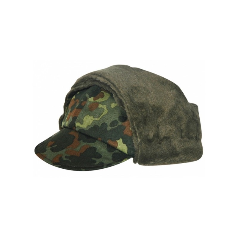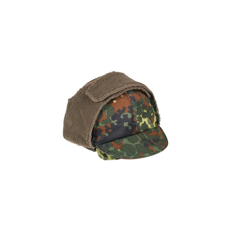 Матерчатая кепка, очень хорошо подходит для суровых зимних условий, шея и уши выполнены с применением искусственного меха, уши имеют липучки, которые застегиваются под подбородком, это обеспечивает отличную фиксацию кепки на голове.
