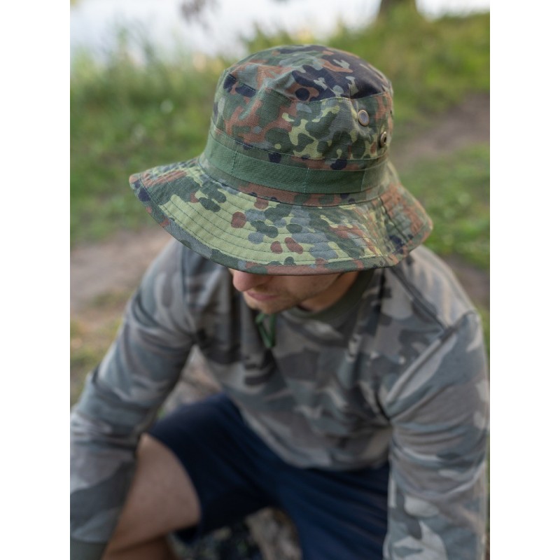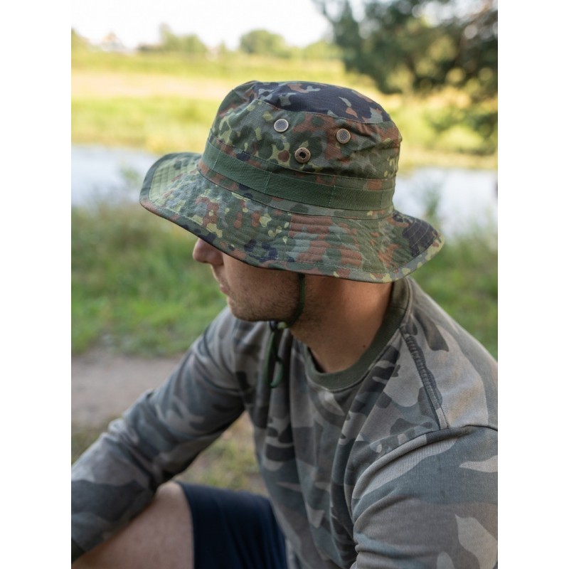 Реплика. Панама US GI - идеальная защита головы в жаркие солнечные дни. У него широкие волнистые поля шириной около 8 см. их можно поднять с помощью ремня для подбородка или кнопок на полях. Петли по периметру служат в качестве удерживающего устройства и для крепления камуфляжа или мелких предметов. Boonie также имеет решетчатые вентиляционные отверстия.