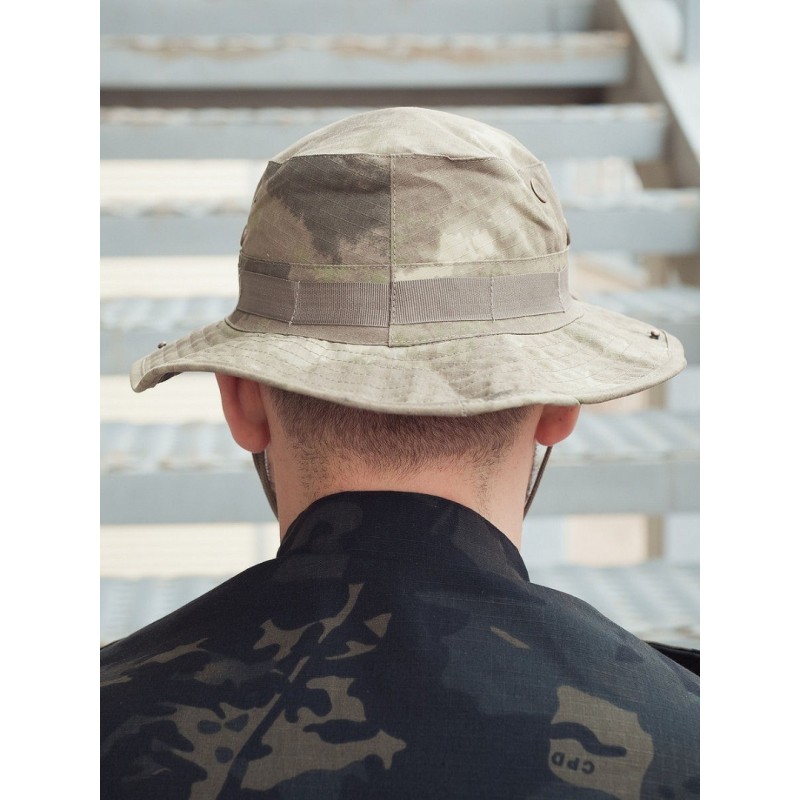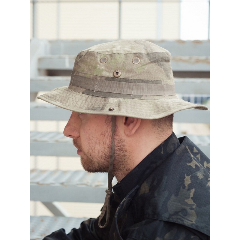 Реплика. Панама US GI - идеальная защита головы в жаркие солнечные дни. У него широкие волнистые поля шириной около 8 см. их можно поднять с помощью ремня для подбородка или кнопок на полях. Петли по периметру служат в качестве удерживающего устройства и для крепления камуфляжа или мелких предметов. Boonie также имеет решетчатые вентиляционные отверстия.