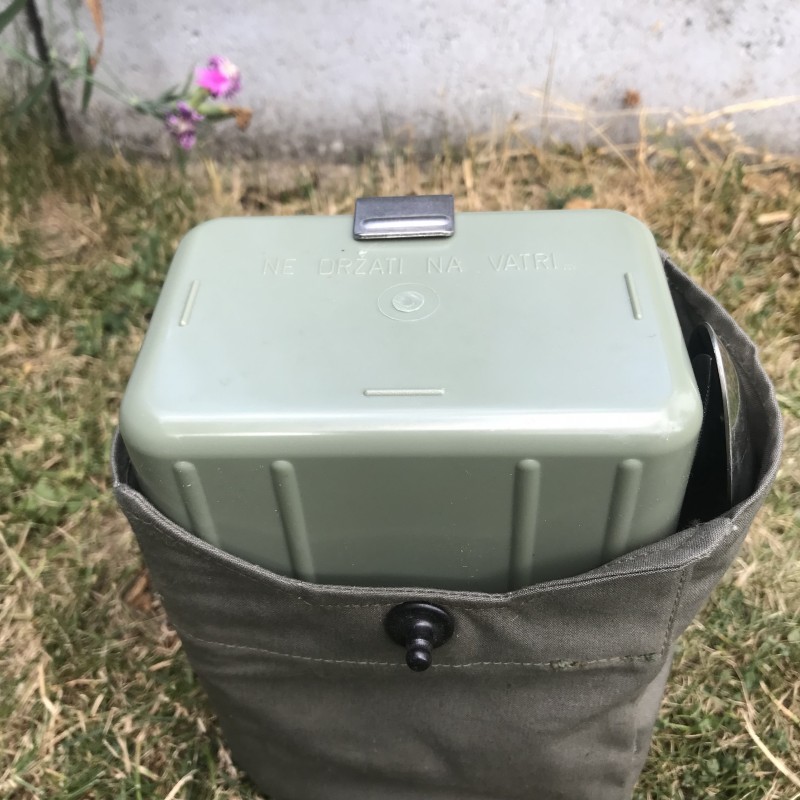 Оригинальный армейский набор для еды армии Югославии включает в себя металлический котелок с ручкой, пластиковую флягу и две пластиковые прямоугольные миски.