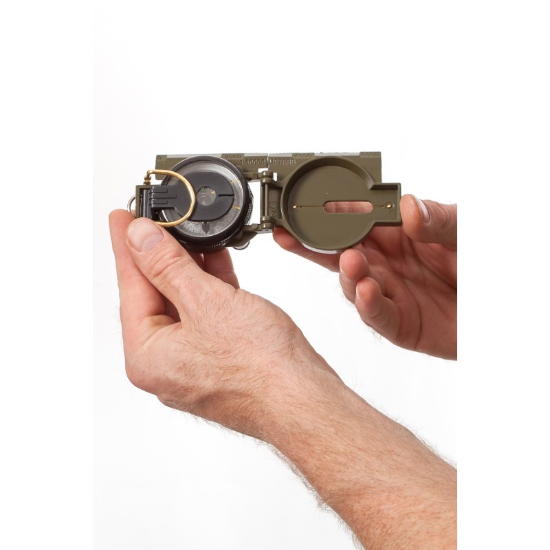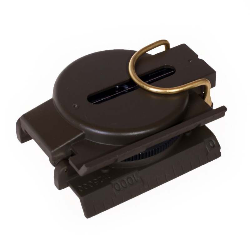 Горный компас высокой точности, имеет прочный и надежный футляр, а также удобную ручку и форму для удерживания его в руке.