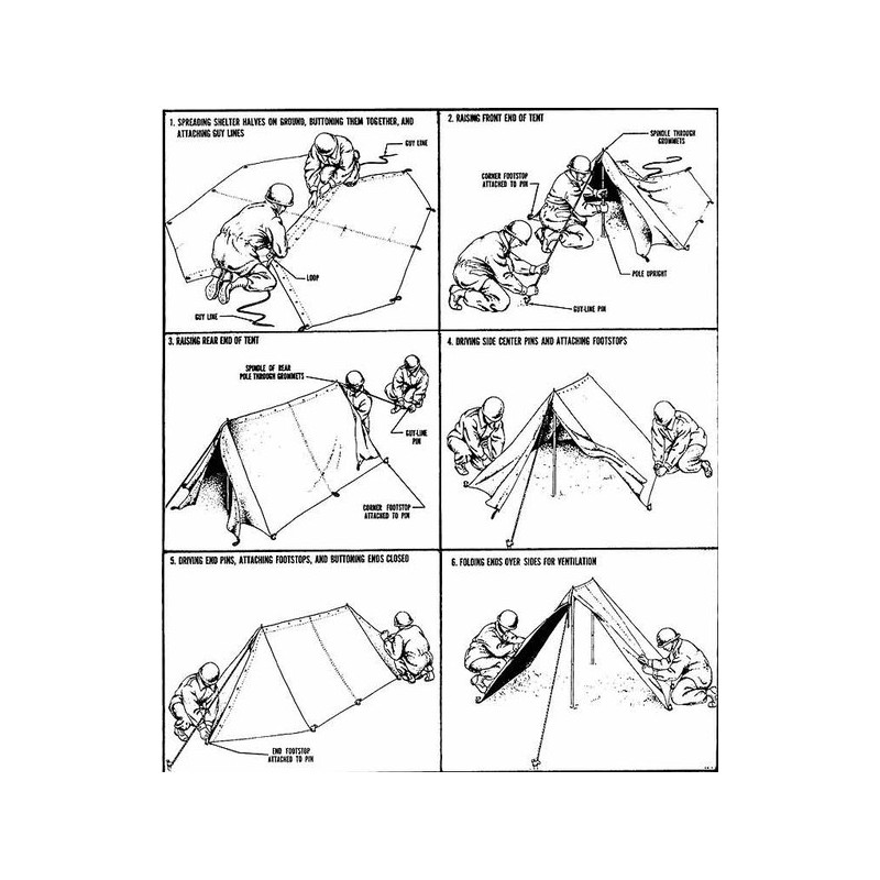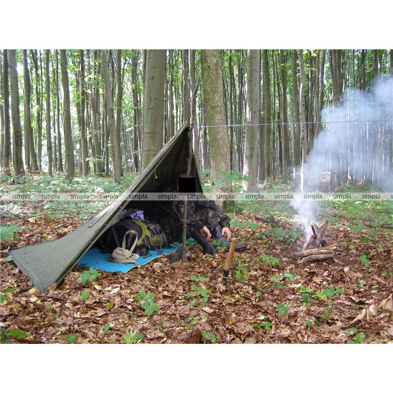 Используется как классическая плащ-палатка,образуя капюшон с помощью двух рядов пуговиц.С помощью пяти колышков (растянув полотно через специальные петли),составной стойки(вставляется в отверстия с люверсами),веревки со стопором для стяжки,можно собрать полноценный односкатный навес для одного человека.Два комплекта позволяют собрать полноценную двухскатную палатку.Кроме этого,может использоваться как тент,подстилка,чехол на рюкзак,защитный материал и прочее.Беречь от огня.